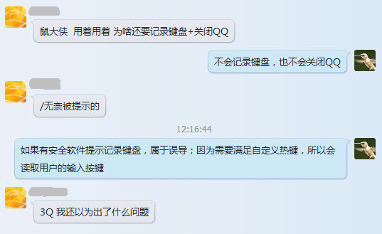 图片中用户反馈会关闭QQ,鼠大王更不可能这样去做了,如果出现这类问题,请全面扫描电脑是否有其他的恶意软件。
